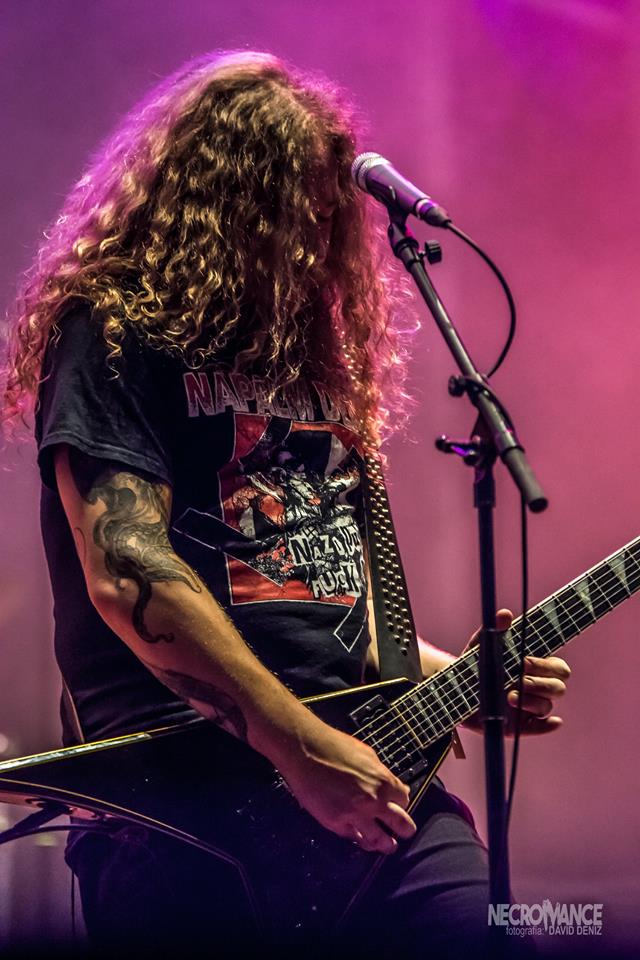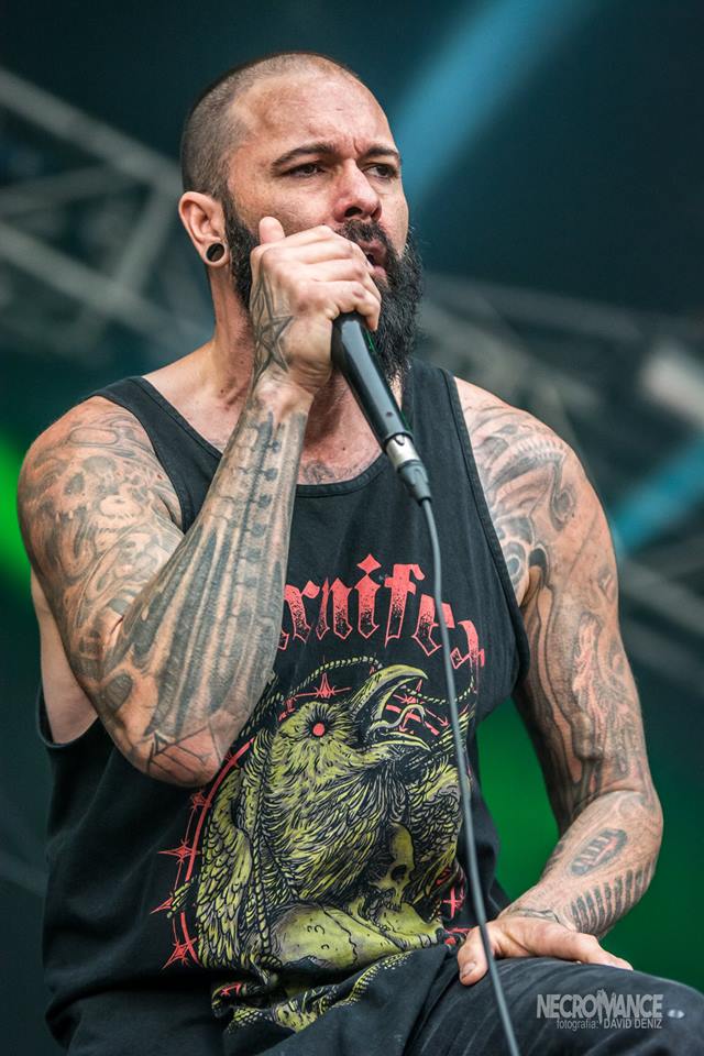 Al termino, volvimos a girarnos y ver a los portugueses THE VOYNICH CODE y su deathcore agresivo y contundente, con los cuales he tenido el gusto de tocar en su tierra con mi banda GODDAMN y sabia como se las gastaban en directo, el cual definiré con solo tres palabras, denso, brutal y contundente. Solo vi la mitad de su bolo porque no quería perderme a UNEVEN STRUCTURE y su rock progresivo y técnico proveniente desde la vecina Francia. Y la verdad es que mereció mucho la pena a pesar de que la gente ya estaba tomando posiciones para ver a MEGADETH y el publico escaseo; ellos se lo perdieron un concierto muy técnico y de ejecución perfecta con un vocalista muy versátil en cuanto a rangos vocales, chapo. Lo mismo que SUFFOCATION del que pude ver el principio de su bolo, un grupazo de death metal brutal donde  Eric Morotti en la percusión es una verdadera bestia, al igual que Rick Myers en las guturales más profundas de todo el festival.