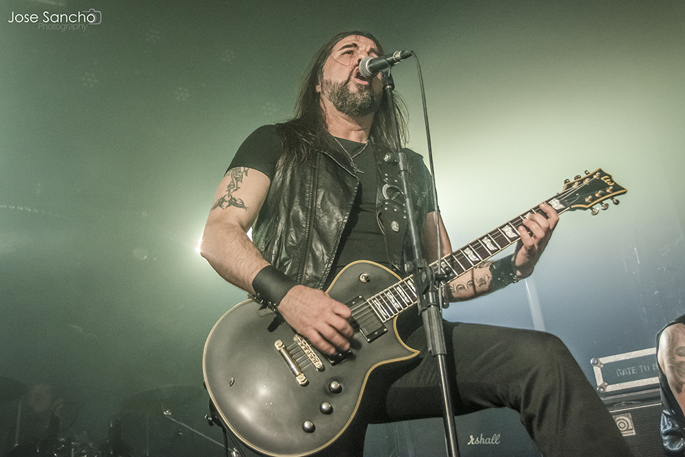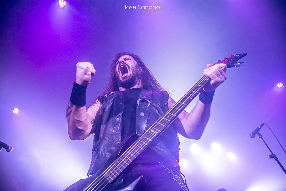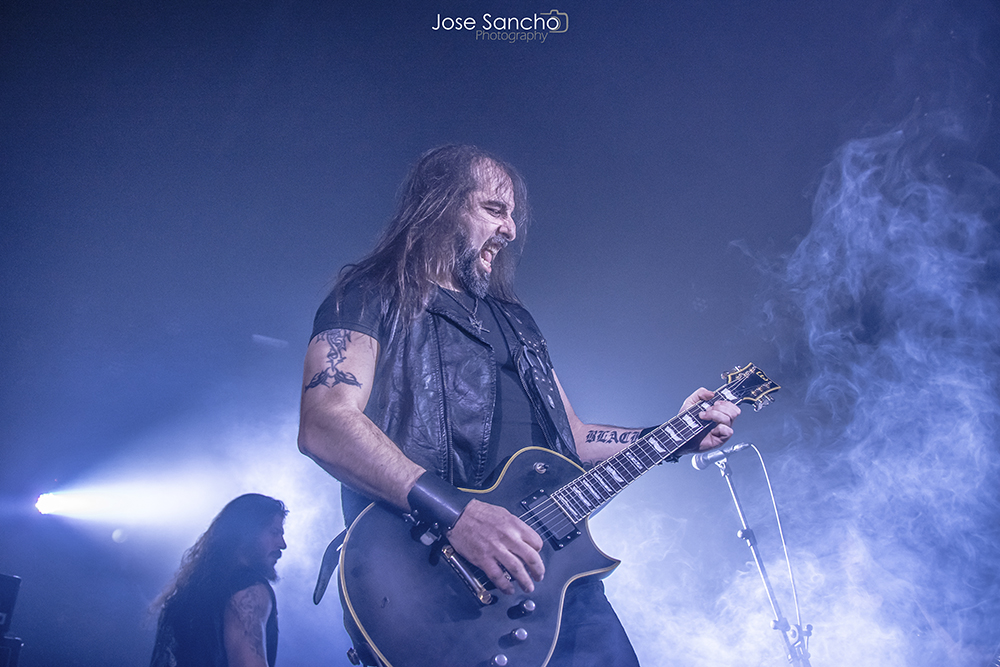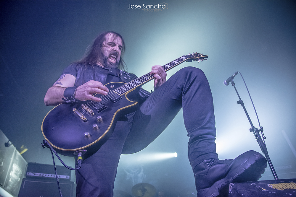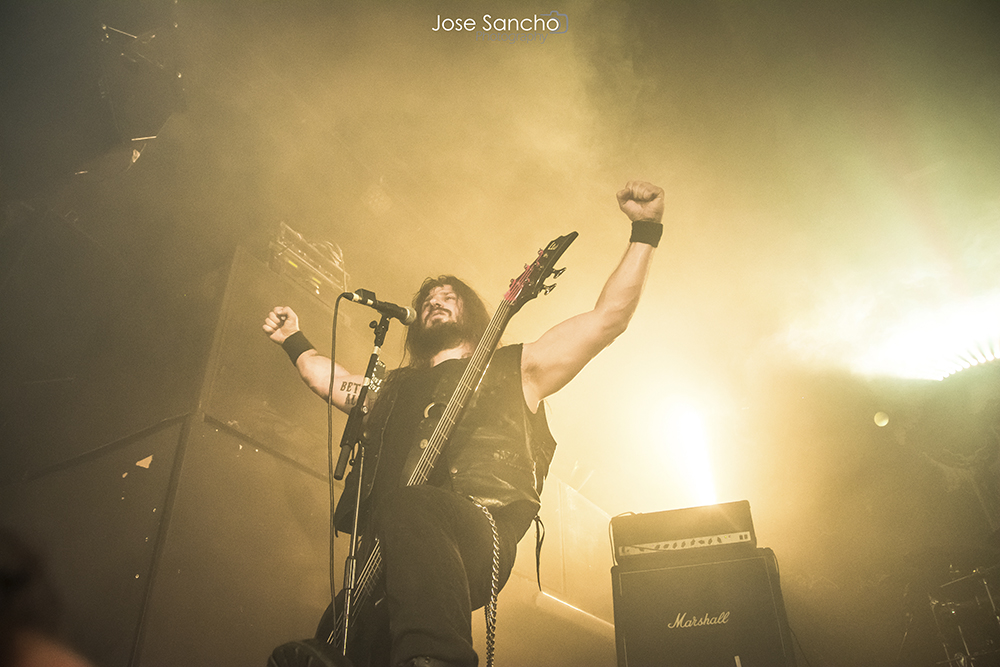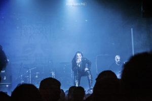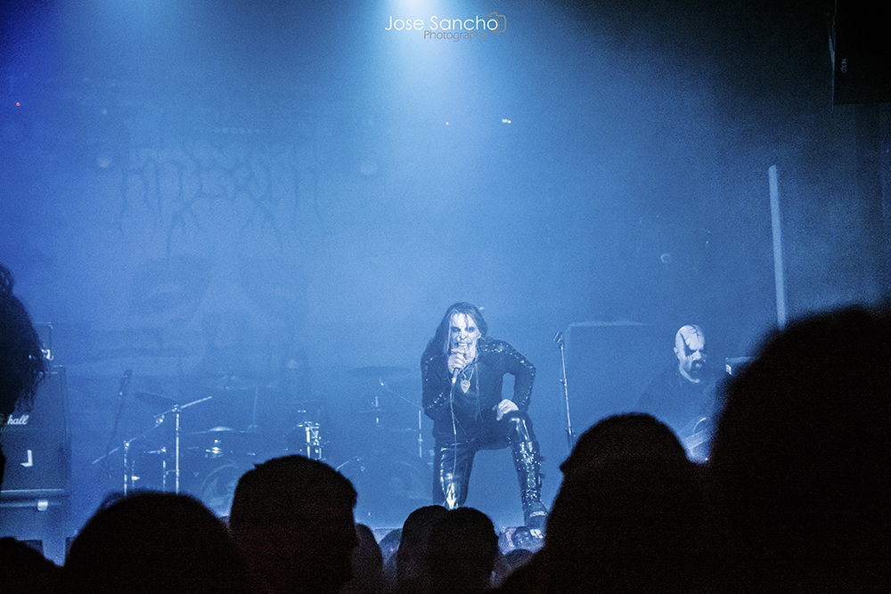 Para terminar y con mucho calor en la sala, salieron por fin sobre el escenario los helenos ROTTING CHRIST que se retrasaron unos minutos. Como no podía ser menos, arrancaron con uno de los canticos de su último álbum “Rituals”, concretamente “Devadevam”. Nada más empezar el tema se podía intuir que iban a ser los grandes triunfadores de la noche, sobre todo en lo que se refiere al sonido que fue aplastante durante toda su actuación. Siguieron con “Kata Ton Demona Eautou” guitarras potentes y agresivas a cargo de Sakis que se metió al público en el bolsillo. Seguidamente tocaron “Demonon Vrosis” de su trabajo “Aealo” que es un tema un poco más lento y donde hay más punteos de guitarra acercándose a la época gótica de la banda. Con “Elthe Kyrie” consiguieron poner la sala patas arriba destacando a los hermanos Tolis (tanto Sakis a las guitarras como a Themis a la batería) sonando de fondo las voces femeninas y los cánticos. Después recitaron su “Apage Satana” con iluminaciones rojas de fondo y puesta en escena por parte de Sakis, Van Ace (bajista) y George Emmanuel (guitarra) de brazos cruzados animando al público a corear los rezos. Acto seguido pasaron a un par de clásicos “The Sing Of Evil Existence” y “Transform All Suffering Into Plagues” de su conocido trabajo del ’93 “The Mighty Contract” que siendo sincera, me resultó un poco extraño porque estoy acostumbrada a oírlos con las voces más rasgadas, y evidentemente después de 25 años, ni se tocan igual, ni se cantan igual. Cayó otro gran clásico de su EP “Passage To Arcturo”, el “Forest Of N’Gai” con un sonido atronador. Y como no podía faltar después de tantos clásicos, vino la versión de la otra banda de Sakis THOU ART LORD “Societas Satanas”, donde él mismo pidió al público hacer un Wall Of Death que siguió con un gran pogo en toda regla en mitad de la sala. Luego comenzaron con los susurros de “In Yumen/Xibalba” y los acordes agresivos de guitarras, que seguía animando al público que ya estaba en el punto más álgido de su euforia. Los helenos anunciaron el último tema de su actuación “Grandis Spiritus Diavolos” y pidieron participación por parte de los que asistimos. Pero ahí no quedó la cosa porque hicieron un par de bises para deleite nuestro, “X Ξ Σ – 666” que es uno de los temas más conocidos de sus últimos discos, y para terminar su gran actuación otro gran clásico “Non Servian”.